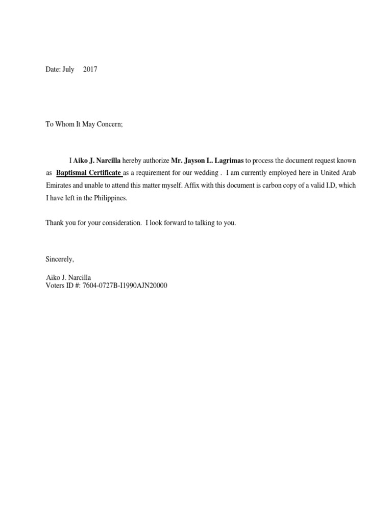 Sample authorization letter to get baptismal certificate. Sample authorization letter for baptismal certificate author: Sample authorization letter for baptismal certificate to whom it may concern. Only statement no.1 is correct.